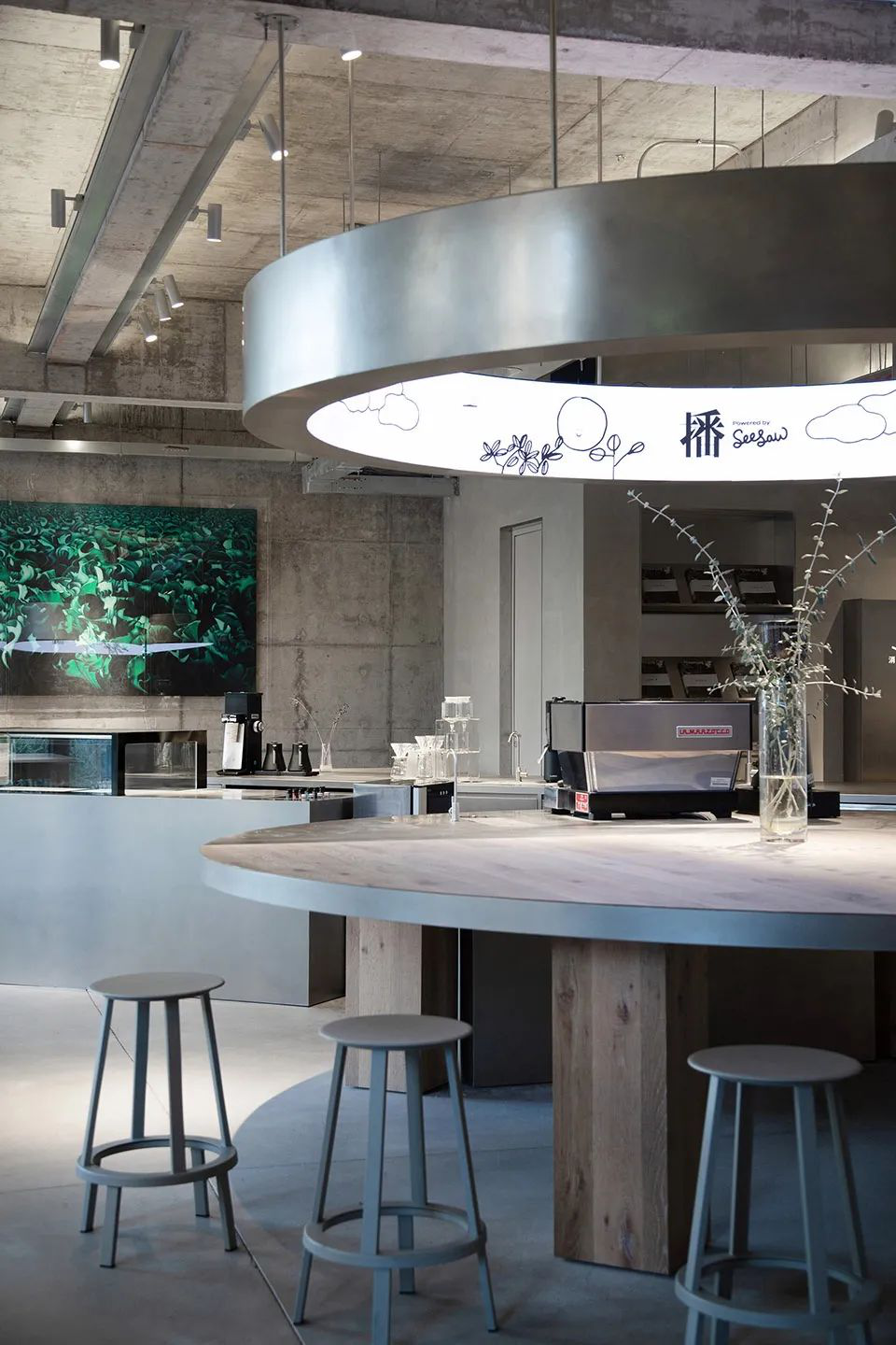 这里的装修是简约工业风,进门有一个巨大的烘豆机,他家的豆子都是自己烘焙,并提供给松江大学城及成都的连锁咖啡店。
