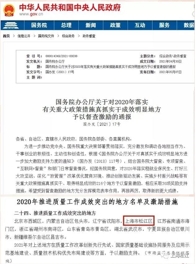 2021年将对松江区等10个市、区在质量工作改革创新先行先试、国家质量基础设施协同服务及应用示范基地建设、质量技术机构优先布局建设等方面,予以激励支持。