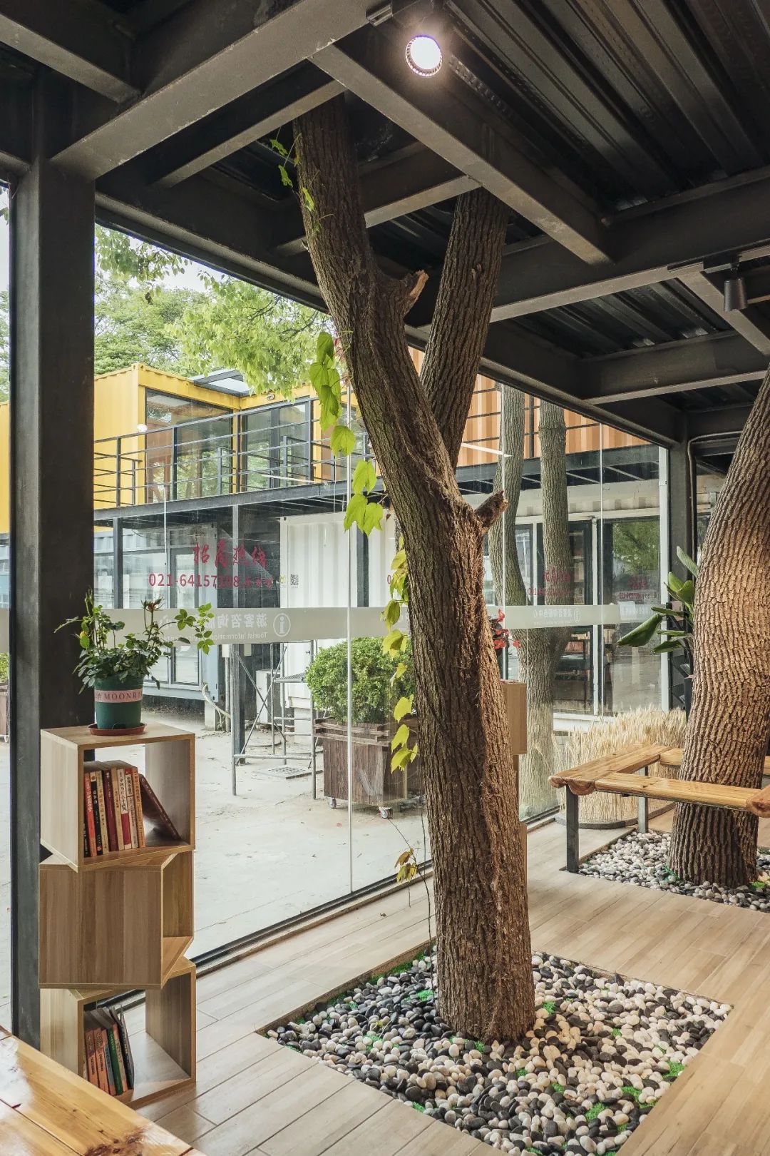 最特别的是这里五棵树穿楼而过,与集装箱形成“大树穿楼过”的“楼树交融”之景,仿佛一片微型树林,树上还有小小的藤蔓,自然清新。