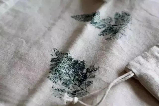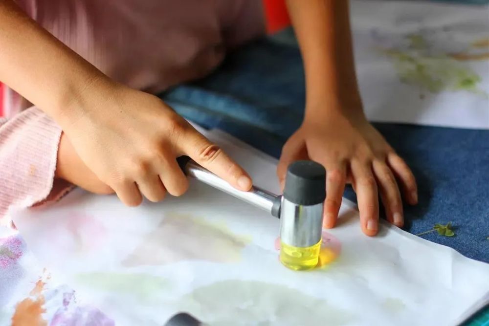 【植物拓染手工布袋】采捡树叶和花朵,洗净后,在布袋上摆出图案,用胶带固定好用小锤子敲打,撕去胶带晾干即可。