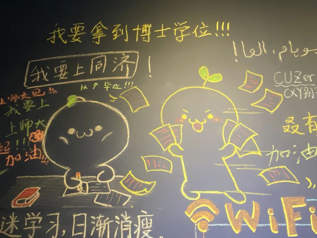 一进学习区,最引人注目的便是两面与墙等高的黑板。“去年刚开业时,上面只有些许涂鸦,现在已经被考生写满了。”店家如是说。小松看到,黑板上写着类似“历史A+”“考研上岸!要努力!”“我要拿到博士学位!”等,每一笔、每一划,都倾注着考生对于未来的无限期许。