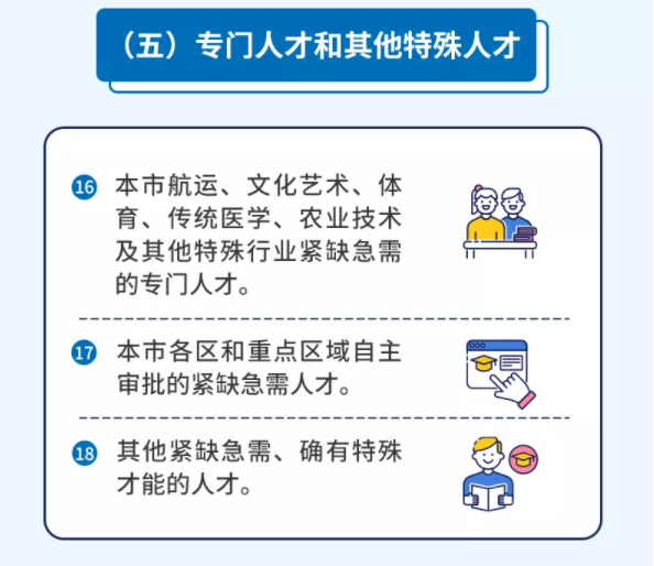 根据上海市人民政府印发《上海市引进人才申办本市常住户口办法》的通知(沪府规〔2020〕25号)规定,用人单位引进的人才在沪工作稳定且依法参加社会保险,具有如下五大类别,18个细分项: