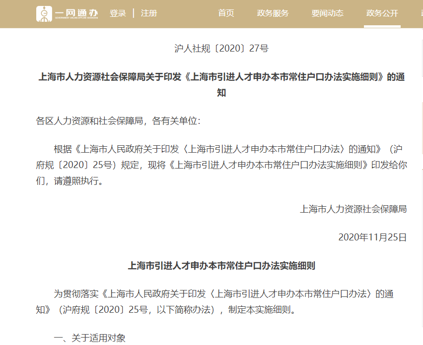 具体细则依据:沪人社规〔2020〕27号《上海市引进人才申办本市常住户口办法实施细则》的通知。
