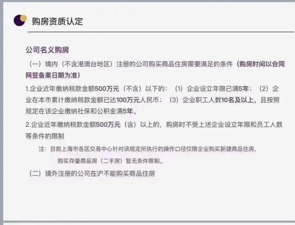 注:目前上海市各区交易中心针对该规定所执行的操作口径仅限企业购买新建商品住房,购买存量商品房(二手房)暂无条件限制。