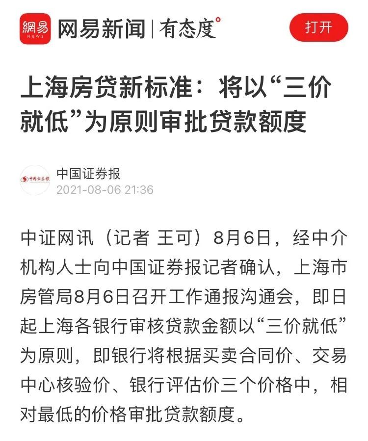 上海自2021年8月6日起,上海二手房房贷再出新规,执行“三价就低”:购房者申请贷款时,将从买卖合同价、交易中心核验价、银行评估价中,选择最低的一项,作为贷款申请房价标准。
