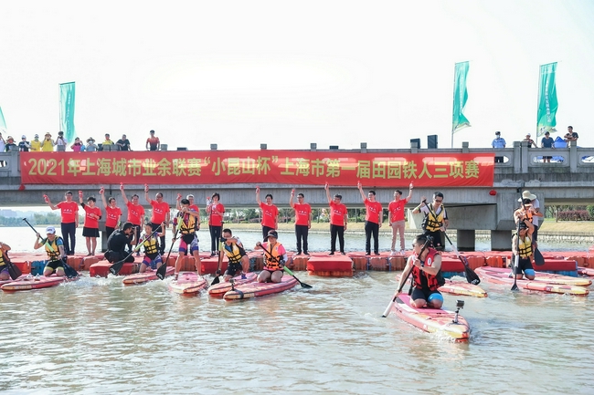 新颖,新潮,更心动!9月25日,上海城市业余联赛“小昆山杯”第一届田园铁人三项赛在上海市松江小昆山镇的万亩粮田间开赛,近300名参赛者以浆板起步、骑行加速、跑步冲刺,完成了一场视觉与体能齐飞的“最美赛事”。