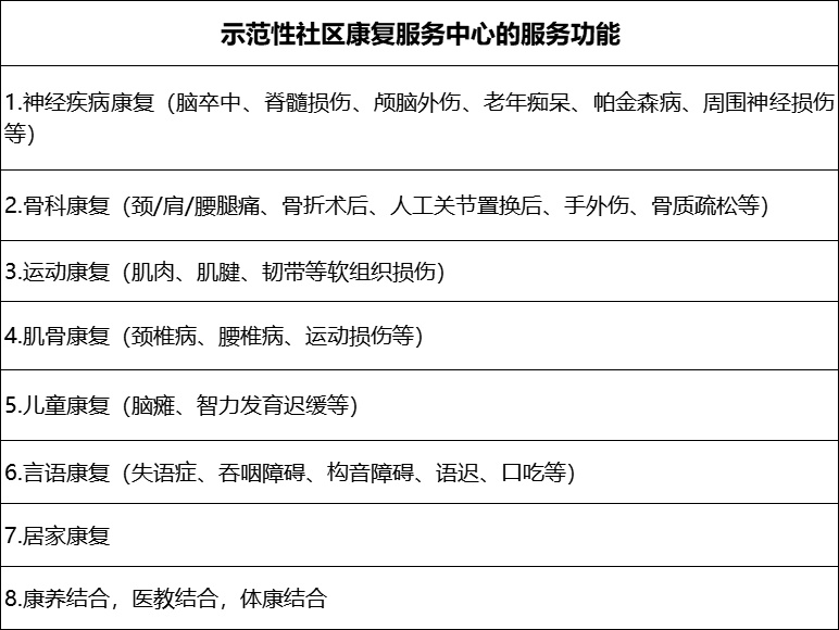 中心以此次创建示范性社区康复中心为契机,进一步优化调整康复服务功能布局,完成物理治疗室、作业治疗室、言语治疗室、感统训练室、传统康复治疗室的设置,形成以病房康复、门诊康复“两位一体”的康复服务布局,提供运动训练、物理因子治疗、作业治疗、言语治疗、感统训练、传统中医适宜技术等服务。