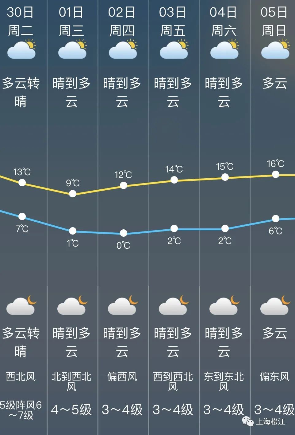 上海市松江区气象台2021年11月29日17时08分发布寒潮蓝色预警信号:受北方强冷空气影响,预计未来48小时内全区最低气温将下降8℃以上,12月1-2日早晨最低气温0-1℃,局部地区有薄冰。