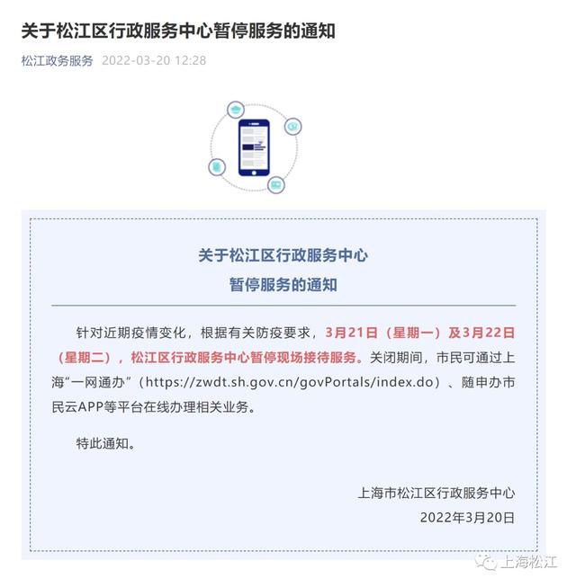 “松江政务服务”发布关于松江区行政服务中心暂停服务的通知:针对近期疫情变化,根据有关防疫要求,3月21日(星期一)及3月22日(星期二),松江区行政服务中心暂停现场接待服务。详情如下