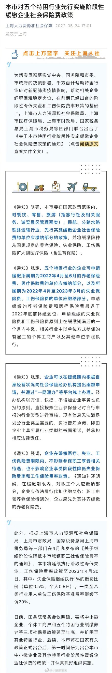 据“上海人力资源和社会保障”微信公众号消息,上海市四部门联合出台了《关于本市特困行业阶段性实施缓缴企业社会保险费政策的通知》。《通知》明确,上海市要在国家政策范围内,对餐饮、零售、旅游(指旅行社及相关服务、游览景区管理两类)、民航、公路水路铁路运输行业,先行实施缓缴企业社会保险费的单位应缴纳部分的政策,并将缓缴险种从国家规定的养老保险、失业保险、工伤保险扩大到医疗保险(含生育保险)。
