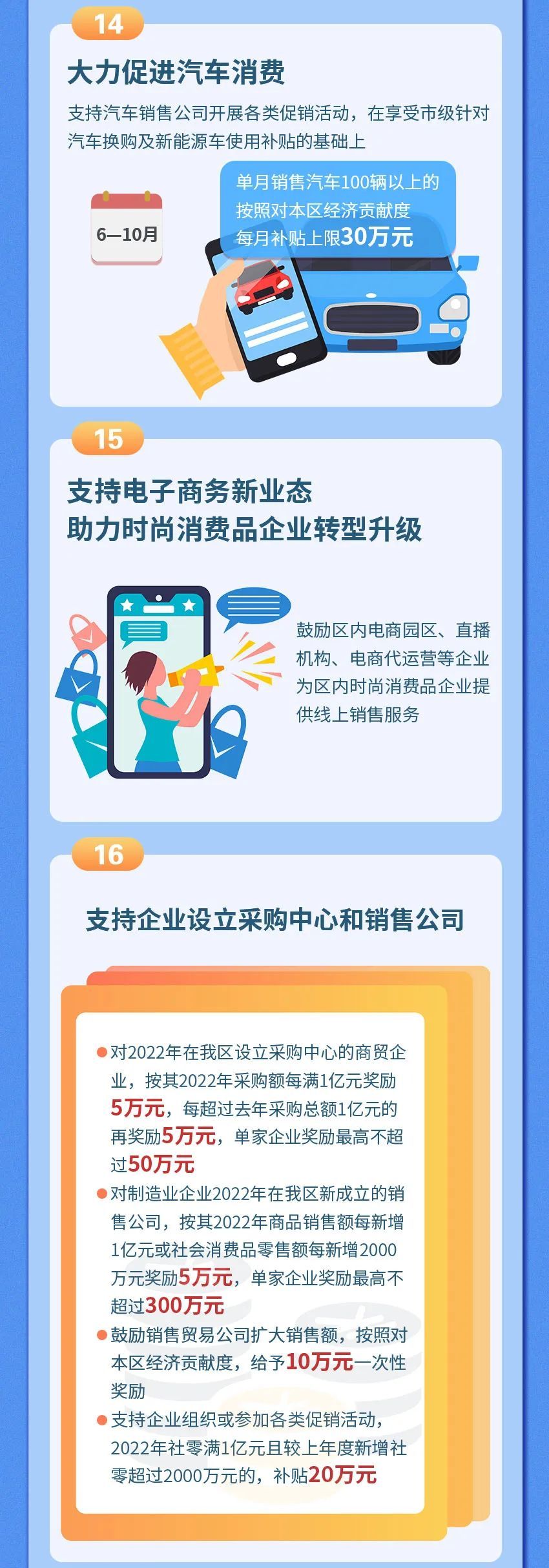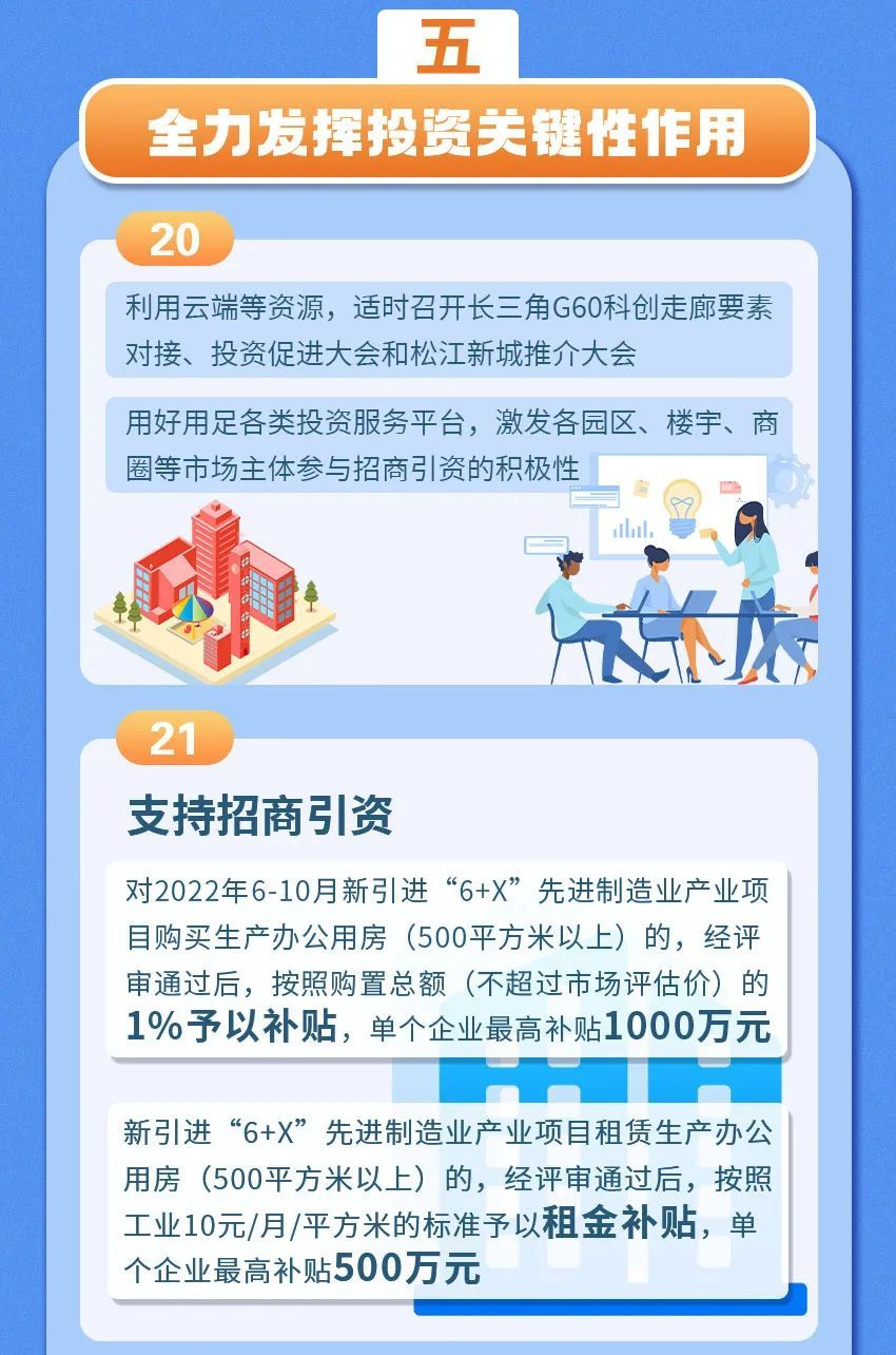在扩投资方面,用好用足各类投资服务平台,支持招商引资。其中,对2022年6月至10月新引进“6+x”先进制造业产业项目购买生产办公用房(500平方米以上)的,经评审通过后,按照购置总额(不超过市场评估价)的1%予以补贴,单个企业最高补贴1000万元。