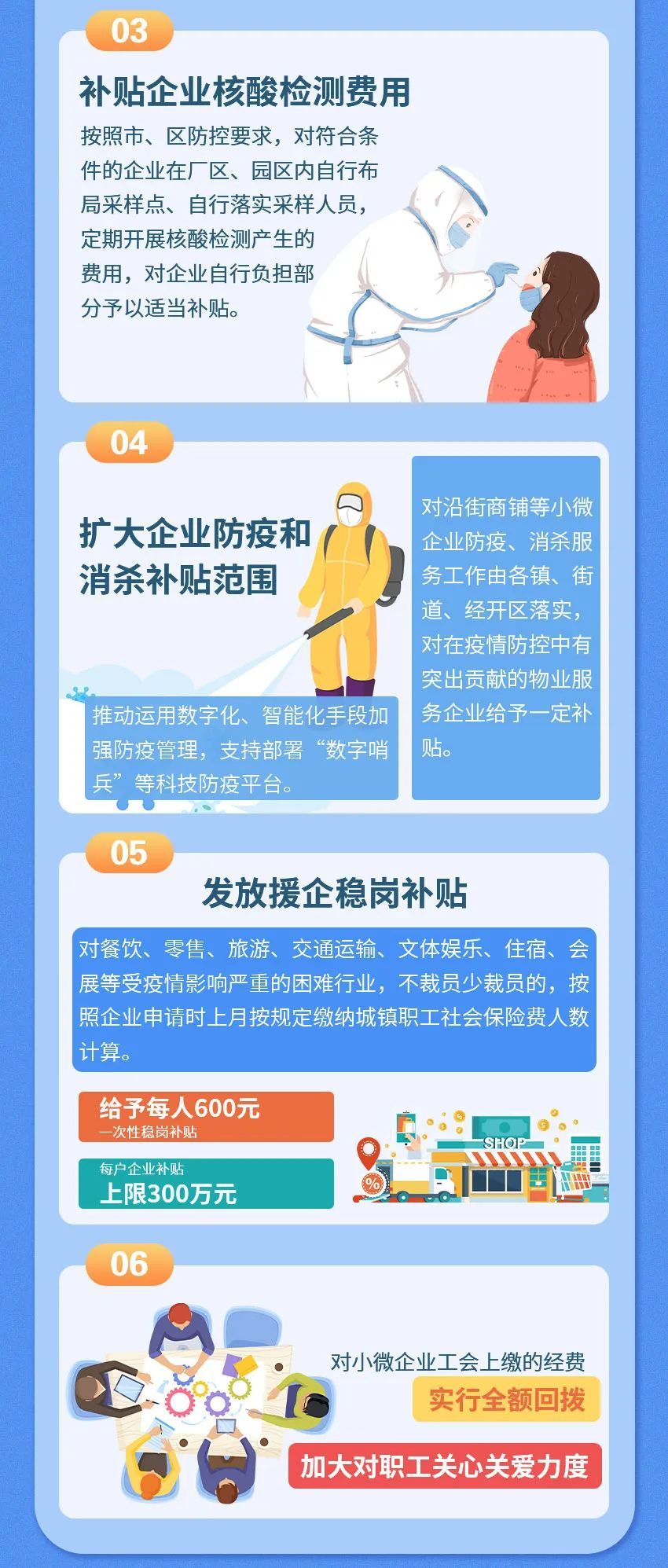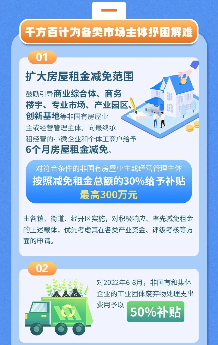 记者从区发改委了解到,为全力助企纾困,松江从扩大房屋租金减免范围、补贴企业核酸检测费用、扩大企业防疫和消杀补贴范围、发放援企稳岗补贴等方面,综合实施“缓免减退补”政策为企业减负。如对符合条件的非国有房屋业主或经营管理主体,按照减免租金总额的30%给予补贴,最高300万元;对2022年6月至8月非国有和集体企业的工业固体废弃物处理支出费用予以50%的补贴;对餐饮、零售、旅游、交通运输、文体娱乐、住宿、会展等受疫情影响严重的困难行业,不裁员、少裁员的,按照企业申请时上月按规定缴纳城镇职工社会保险费人数计算,给予每人600元一次性稳岗补贴等。