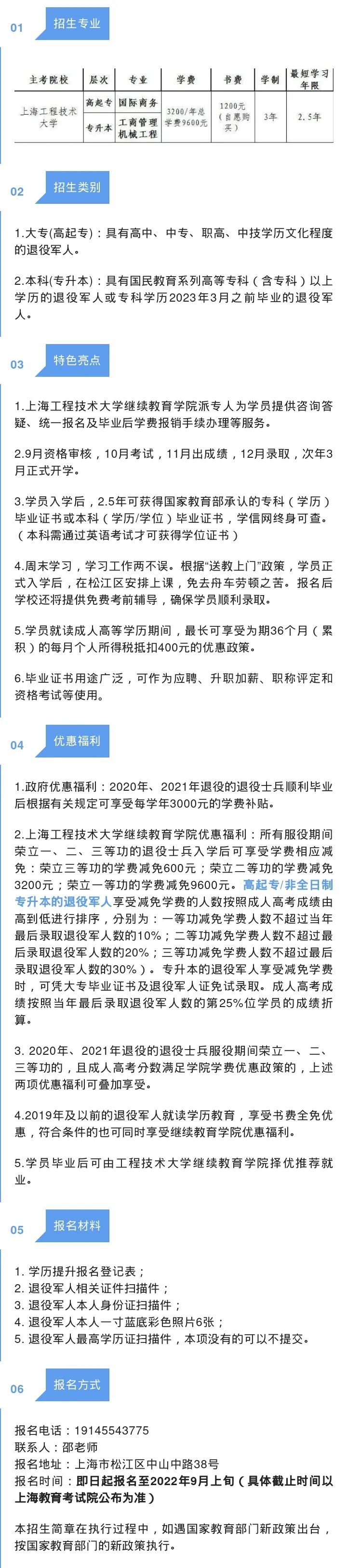 为更好地为退役军人搭建学历提升平台,助力后续就业创业,松江区退役军人事务局与上海工程技术大学继续教育学院合作开设退役军人学历提升学习班,详情如下↓↓↓