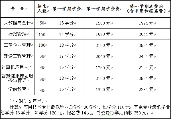专科:报名费14元;书资费:350元;第一学期的学分费。
