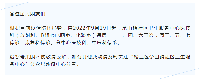 松江区岳阳街道社区卫生服务中心发布公告:根据当前疫情防控形势,岳阳街道社区卫生服务中心自2022年9月19日起:中心除内科、伤科、西药房、计划免疫开诊外(口腔科9月21日至23日开诊),其余科室和卫生站全部停诊,恢复时间另行通知。