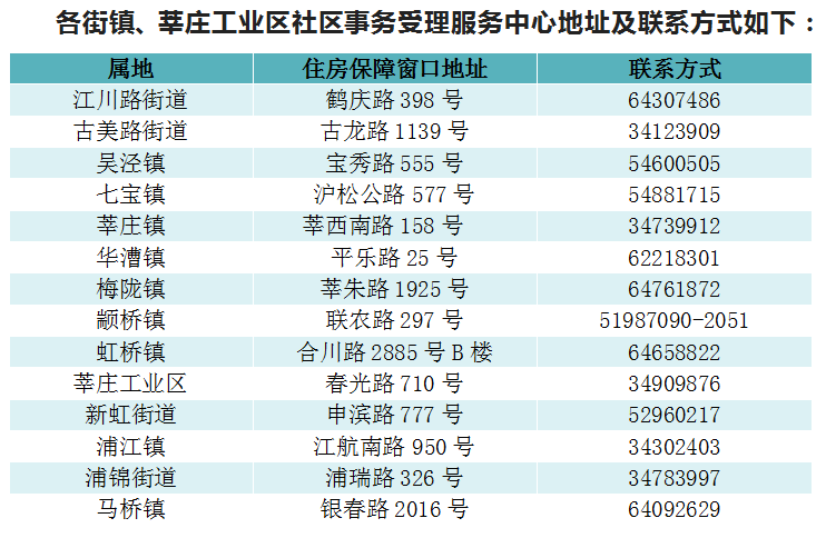 各街镇、莘庄工业区社区事务受理服务中心住房保障窗口(政策咨询、申请受理)