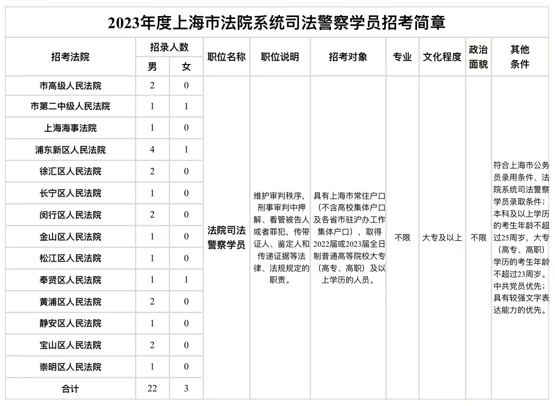 市公务员局介绍,2023年上海市公安、法院系统警察学员招考启动,计划招考公安系统人民警察学员500名(其中女性50名);计划招考法院系统司法警察学员25名(其中女性3名)。