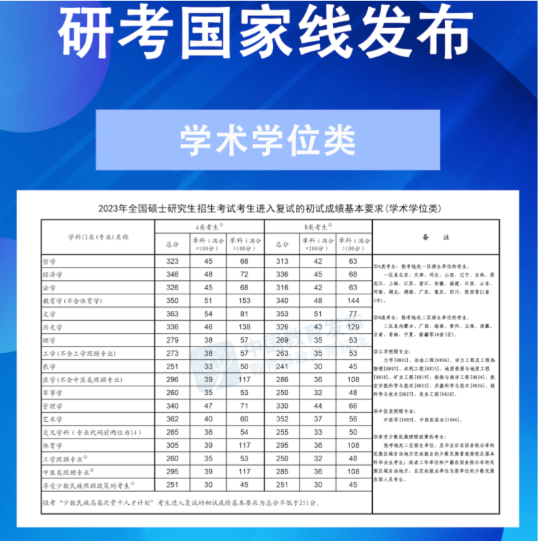 教育部同时发布《2023年全国硕士研究生招生考试考生进入复试的初试成绩基本要求》(国家分数线)。根据《2023年全国硕士研究生招生工作管理规定》,各招生单位将在国家分数线的基础上,自主确定并公布本单位考生进入复试的初试成绩要求及其他学术要求。
