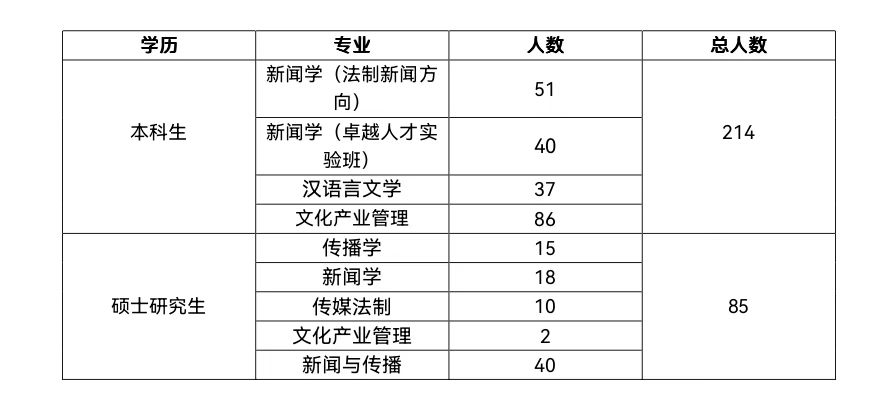 学院始终坚持社会主义办学方向,不断加强党的全面领导,坚守为党育人、为国育才初心使命,落实立德树人根本任务,以国家战略和社会需求为导向,着力培养高素质、创新型、复合应用型卓越新闻传播人才。除升学深造外,毕业生就业去向多为党政机关、文化传媒公司、网络科技公司、高校科研机构、国有企业及银行等。