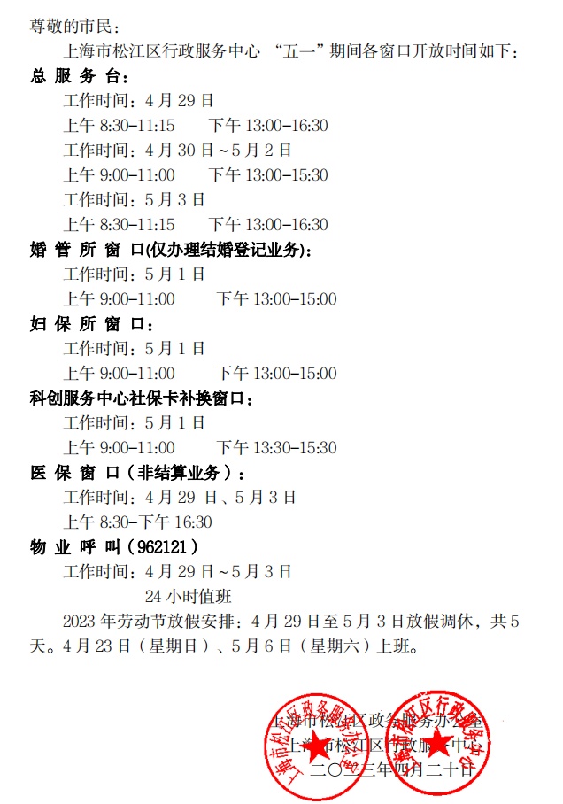 松江区行政服务中心“五一”期间窗口开放时间,看这里
