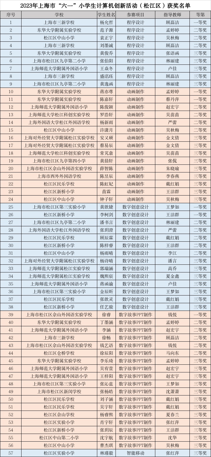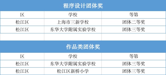 近日,2023年上海市小学生计算机创新活动成绩公布,松江区小学生取得一等奖6项、二等奖17项、三等奖34项、团体奖4项的好成绩,松江区青少年活动中心荣获优秀组织奖。