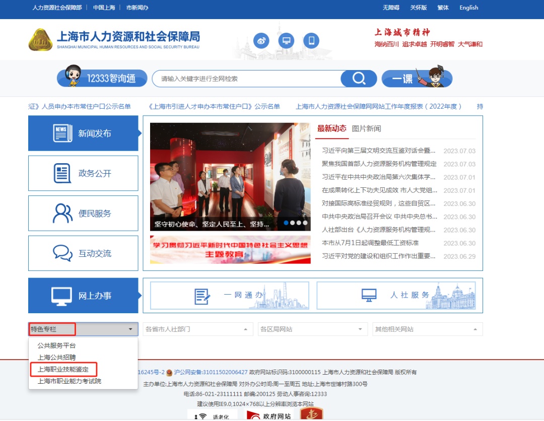 劳动者进入上海市人力资源和社会保障局官网https://rsj.sh.gov.cn/,点击“特色专栏”,选择“上海职业技能鉴定”。