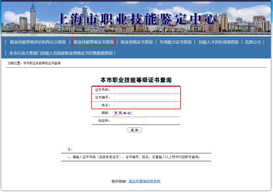 点击“职业技能等级证书查询”,输入证件号码(包括其他证件)、证书编号、姓名其中任意两项,输入验证码,即可查询经本市核发的职业技能等级证书信息。