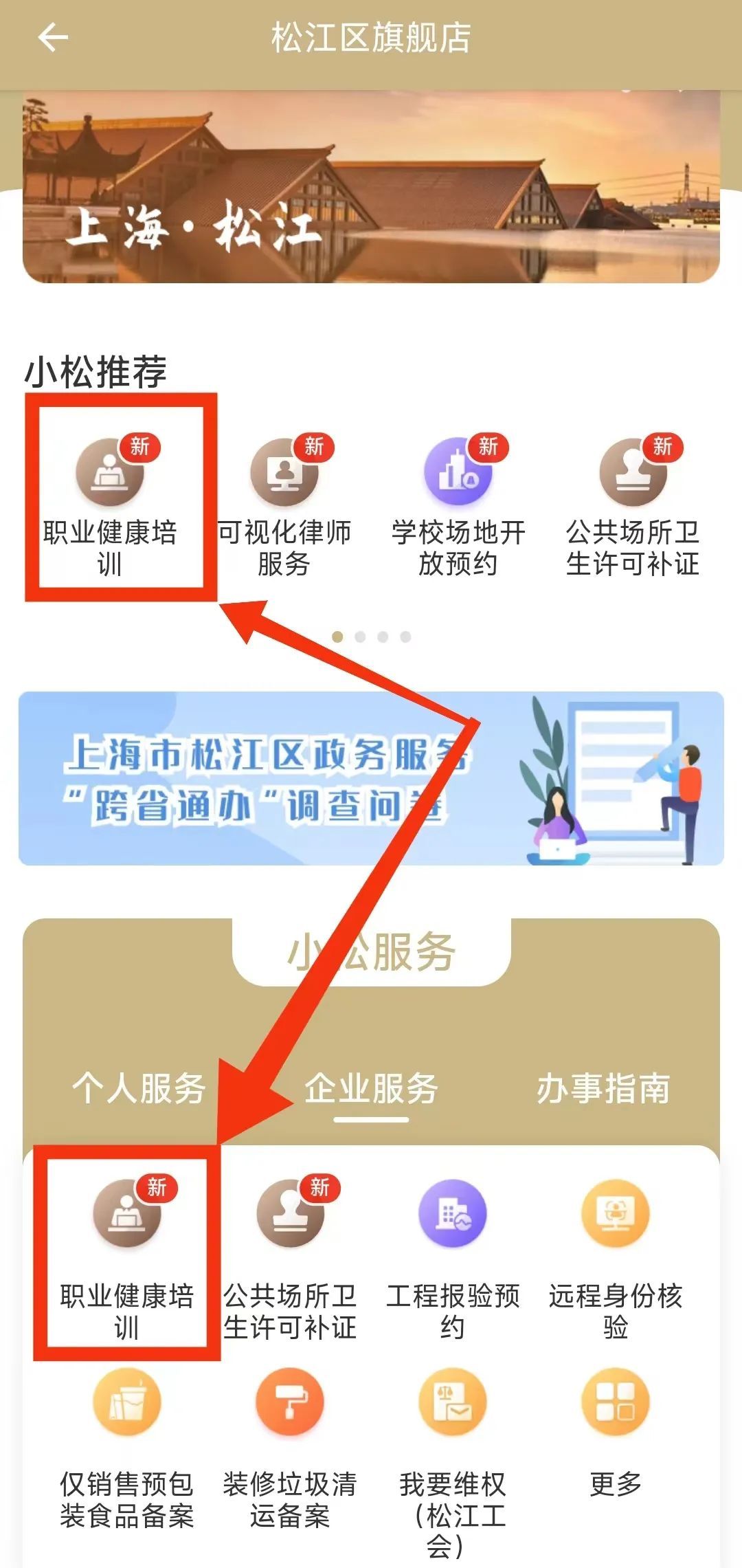 市民可在“随申办市民云”app或小程序中搜索“松江旗舰店”,在企业服务栏进入“职业健康培训”,登记信息后进行学习。如考试未合格,也可以通过题库训练巩固,再参加补考。
