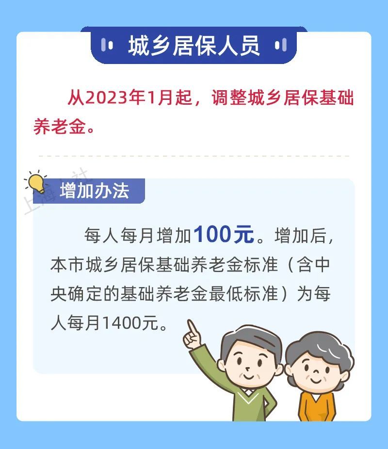 与此同时,本市从2023年1月起,调整城乡居保基础养老金,每人每月增加100元。增加后,本市城乡居保基础养老金标准(含中央确定的基础养老金最低标准)为每人每月1400元。