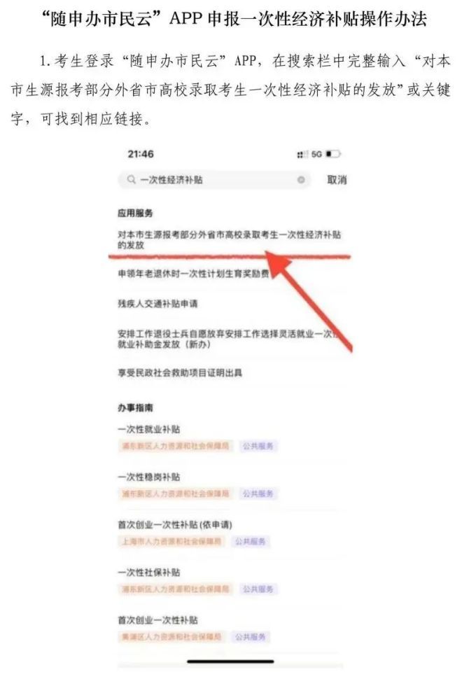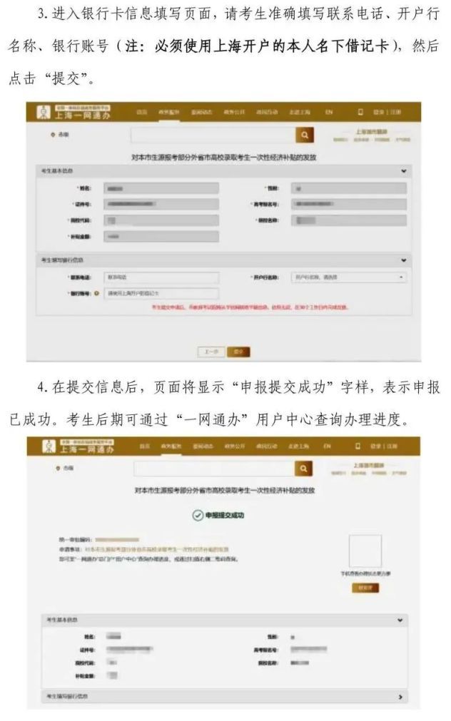 符合条件考生可于2023年10月8日至12月31日期间登录“一网通办”网站(https://zwdtuser.sh.gov.cn/)或“随申办市民云”app,搜索关键字“一次性经济补贴”找到补贴申请链接(具体操作办法附文末),登入补贴申请平台并填写相关申请信息(注:申请信息中的银行卡必须使用上海开户的本人名下借记卡)。