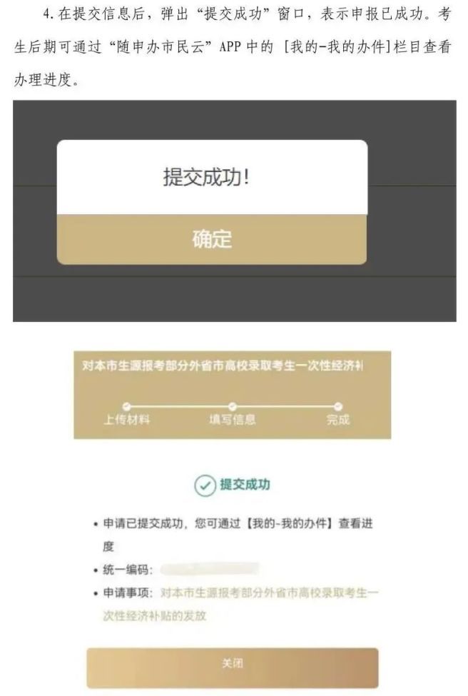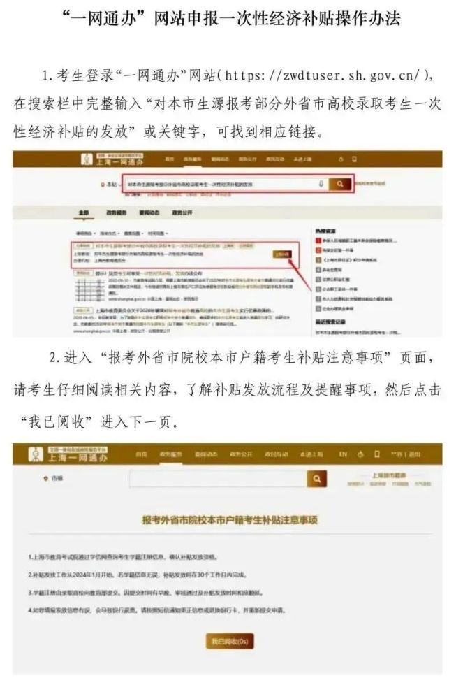 市教育考试院介绍,2023年被部分外省市普通高校录取的上海市常住户口考生,符合补贴范围的可申领一次性经济补贴。符合条件考生可于2023年10月8日至12月31日期间登录“一网通办”网站(https://zwdtuser.sh.gov.cn/)或“随申办市民云”app,搜索关键字“一次性经济补贴”找到补贴申请链接,登入补贴申请平台并填写相关申请信息。具体操作办法详见↓根据《上海市教育委员会关于2023年继续对报考外省市普通高校的我市生源考生实行优惠政策的通知》(沪教委学〔2023〕26号)要求,2023年被部分外省市普通高校录取的我市常住户口考生,符合补贴范围的可申领一次性经济补贴。