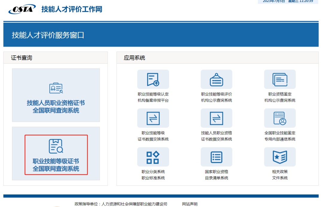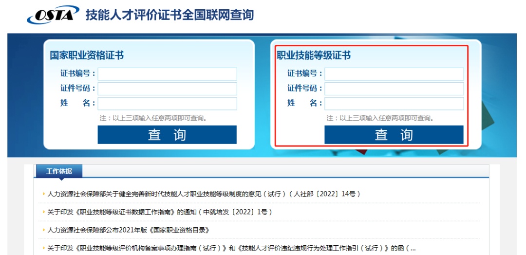 (4)同时,从技能人才评价工作网首页“职业技能等级证书全国联网查询系统”进入,也可查询经本市核发的职业技能等级证书信息。