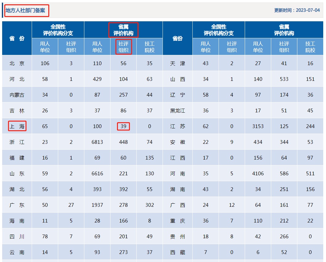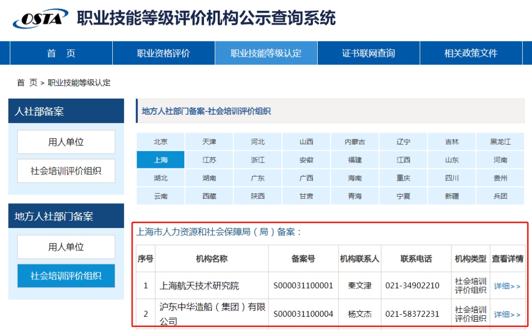 (2)进入后,下拉找到“地方人社部门备案”,找到“上海”,“省属评价机构”栏目中“社评组织”相应数目,点击进入,可查询本市已备案社会培训评价组织相关信息。