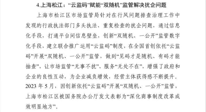 据了解,为解决在行风问题排查治理工作中发现的行政执法部门多头执法、重复检查的扰企问题,松江区市场监督管理局通过信息化改造和创新数字化监管手段,在全国首创依托“云监码”开展“双随机、一公开”监管。2023年5月,因创新依托“云监码”开展“双随机、一公开”监管,上海市松江区被国务院办公厅发文表彰为“深化商事制度改革成效明显地方”。