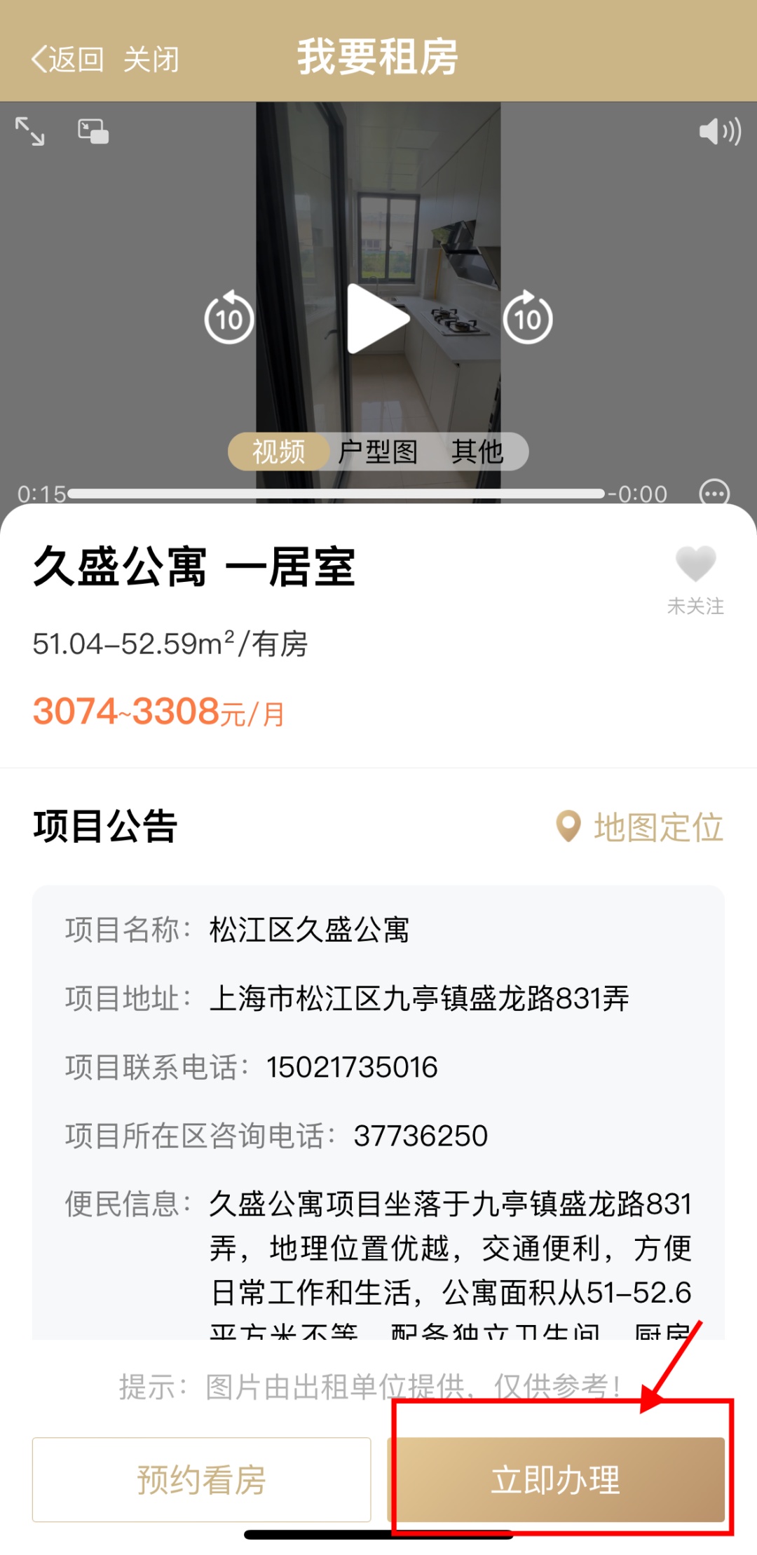 进入“随申办”app,搜索“我要租房”,选择“保障性租赁住房服务”,进入后点击“我要找房”,输入项目名称“久盛公寓”,随后点击“立即办理”即可按照提示填写申请。