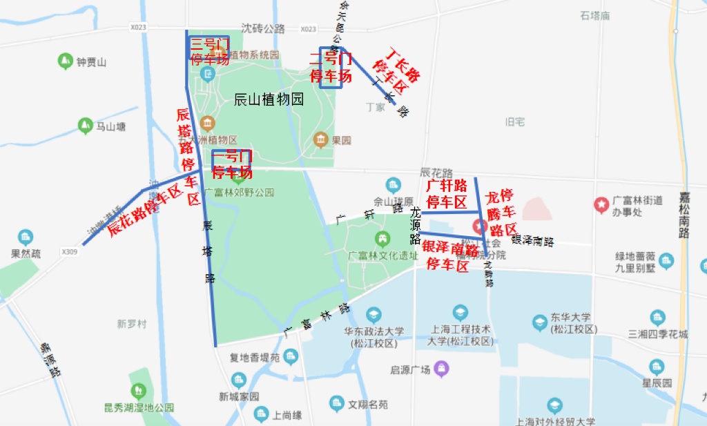 停车场饱和后,上海辰山植物园周边将及时开放辰塔路(广富林路-沈砖公路)、丁长路(佘天昆公路以东)、辰花路(辰塔路以西)等道路临时停车区,广富林文化遗址周边将开放龙腾路(广富林路—辰花路)、银泽路(龙源路—龙腾路)、广轩路(龙源路—龙腾路)等道路临时停车区,驾驶员请根据道路标志标线及现场民警、辅警指挥,有序停放车辆。