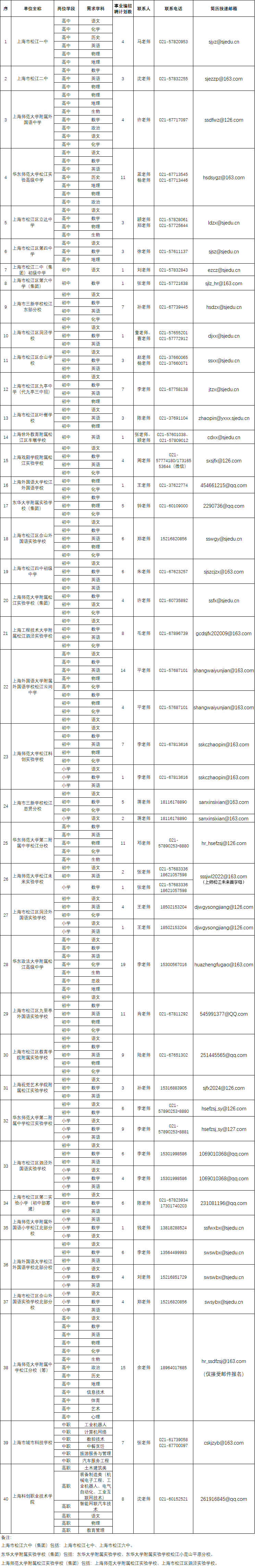 上海市松江区中小学(含中高职)事业编和储备教师,以及幼儿园储备教师。具体需求类型、岗位名称及招聘计划数等信息见附件。