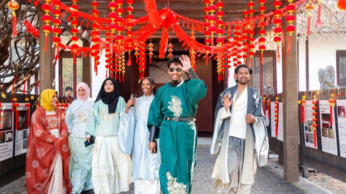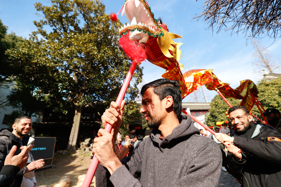 活动上,中外学生身穿着汉服逛新春“市集”,大家跟着老师学唱戏曲,兴致盎然地参与舞龙等活动,体验春节民俗文化,感受中国传统文化魅力和浓浓的年味,迎接春节到来。