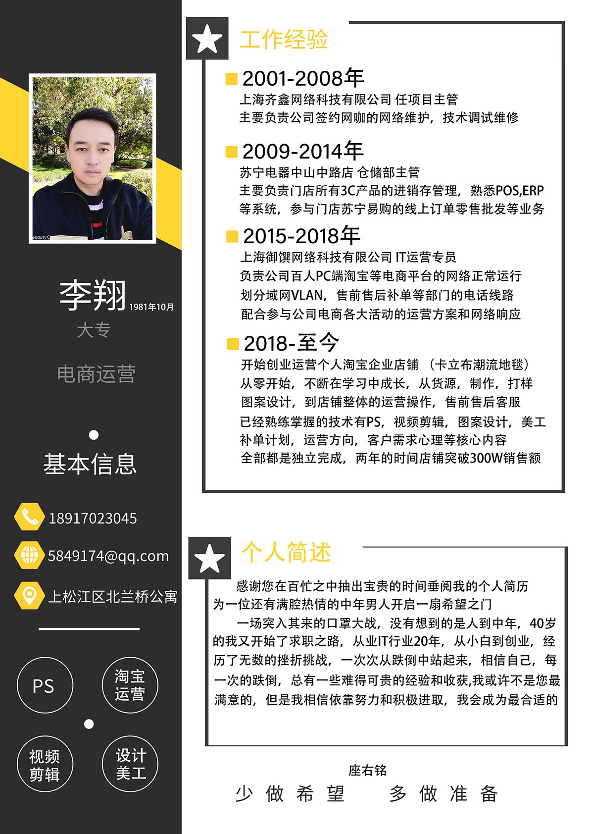 96年毕业计算机调试与维修(获得中级计算机职称证书),01年至08年,于上海齐星网络有限公司担任网络技术员,主要工作负责大型网吧或公司内部的服务器架设、局域网的网络工程施工及弱电布线和后期的软件调试等工作,精通电脑调试维修及网络故障排除及解决,09年至14年于苏宁电器物流系统管理ERP,POS系统相关工作,维护门店日常办公电脑系统,14年至今主要倾向于电商企业公司内部网络总体布局与日常计算机维护,行政管理等相关工作(对电商设计,运营等企划有一定的认知能力和操作能力),18年开始创业从事淘宝电商,从运营,拍摄,短视频剪辑,PS详情页,客服,货源,设计,一个人独立完成,个人店铺年销售额突破200W+,因口罩特殊时期带来的影响,目前暂时为自由职业者