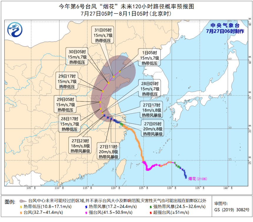 预计,“烟花”将先以每小时10公里左右的速度向西北方向移动,28日以后将转向东北方向移动,强度逐渐减弱。