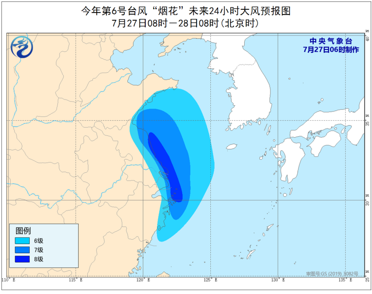 中央气象台说,今早7时,“烟花”位于江苏省溧阳市境内(北纬31.3度、东经119.5度),中心附近最大风力有8级。