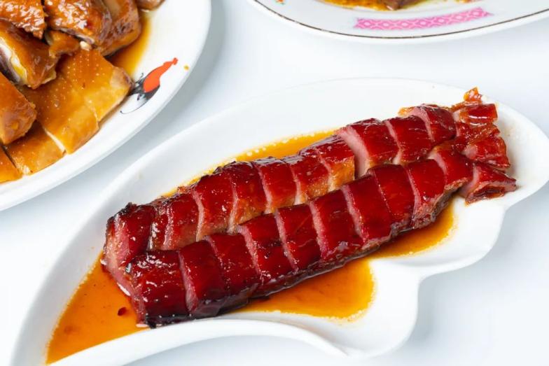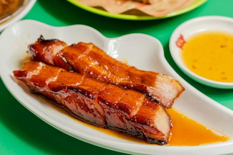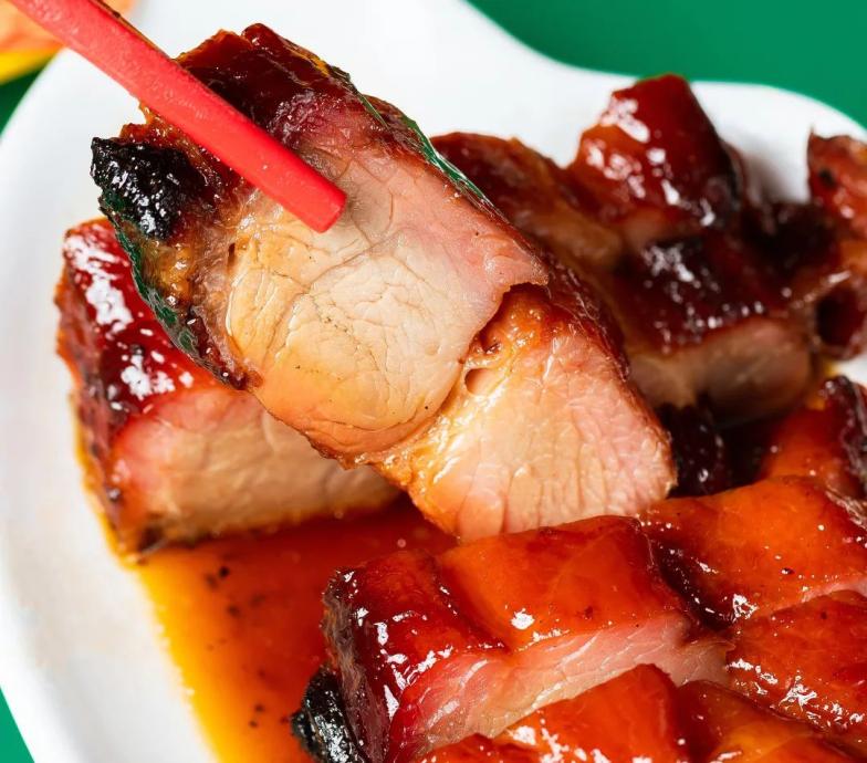 每一块叉烧都是半肥半瘦,是最传统的蜜汁味,但是甜度控制得刚刚好。选用的是上等梅头肉,每一块切得薄厚均匀。上桌之前就需要烧制足足40分钟,蜜汁的香甜融合到每一丝肉里面。