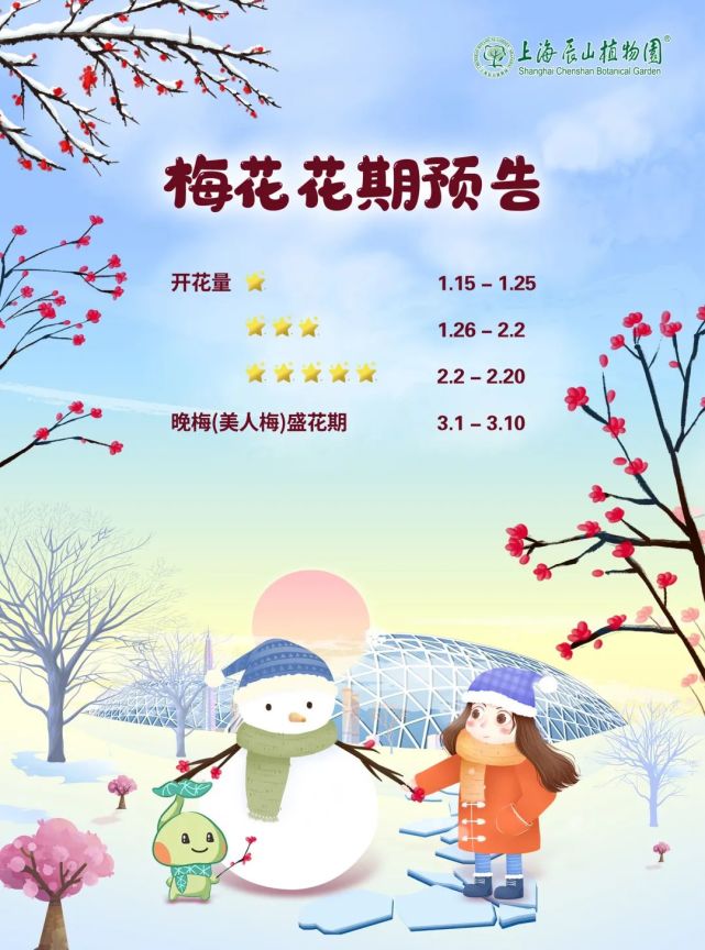 辰山植物园赏梅期来啦!辰山植物园的梅花多数为中花品种,最佳观赏期最长15天,最短8.5天,观赏时间主要受温度影响~