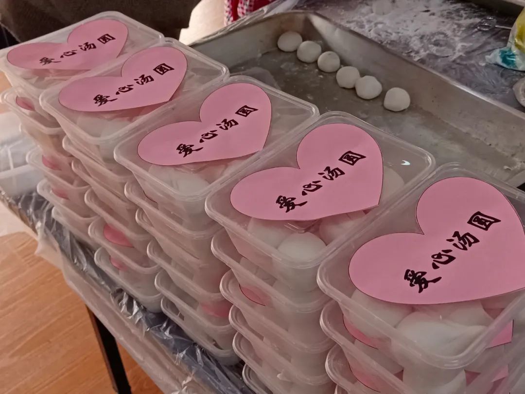 支起一张长案,备上甜、咸两种口味的馅料,社区里的阿姨们早早包起了汤圆。不一会儿,孩子们跟着爸爸妈妈、爷爷奶奶来到现场,小手捏着面团,像模像样地跟着阿姨们学习包馅、封口,再搓成团子状。包好的汤圆一部分下了锅,另一部分则被打包成盒,贴上标签,等待着爱心“快递”。
