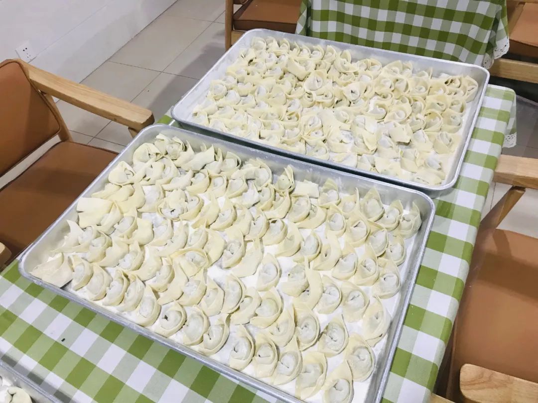 在包馄饨环节,彩虹助手和老年朋友们动作娴熟、有条不紊,现场欢声笑语不断,大家相互比赛,比谁的馄饨包得好看,还不时切磋技巧。一会儿工夫,一排排包好的馄饨整齐地呈现在眼前,看着自己的成果,大家脸上露出了喜悦的笑容。