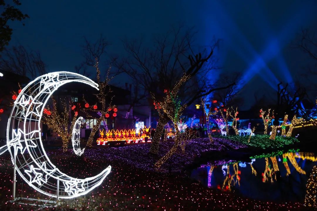 “东风夜放花千树,更吹落、星如雨。”辛弃疾曾在词中这样形容元宵节满城灯火的热闹景象。在松江,持续半个多月的广富林文化遗址2022新春游乐会为广大市民奉上了一场集科技和艺术于一体的光影盛宴。漫步在夜晚的广富林,无论是亭台水榭,还是石桥流水,只见处处光带璀璨,火树银花,给人以如梦如幻的感官体验。