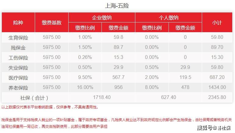 以2022年1月份的上海社保最低缴纳基数5975元来计算,社保费用是2345.80元,其中公司部分需要缴纳的费用共1718.40元,职工个人部分需缴纳627.40元;