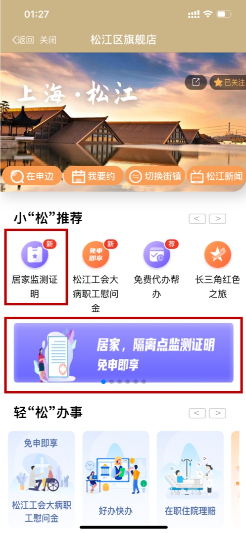 居民可通过“随申办”微信小程序、“随申办”App、“随申办”支付宝小程序进入松江旗舰店首页,点击选择“居家监测证明”服务便可使用。
