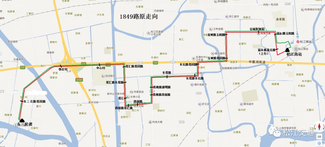 1849路原走向:(上行)自东三轮渡起经东三路、闵塔公路、塔汇公路、育新路、辰塔路、长塔路、长石公路、闵塔公路、玉树路、玉阳路、富永路、盐仓路至松江南站。(下行)自松江南站起经盐仓路、中桥路、富永路、玉阳路、玉树路、闵塔公路、长石公路、长塔路、辰塔路、育新路、塔汇公路、闵塔公路、东三路至东三轮渡。