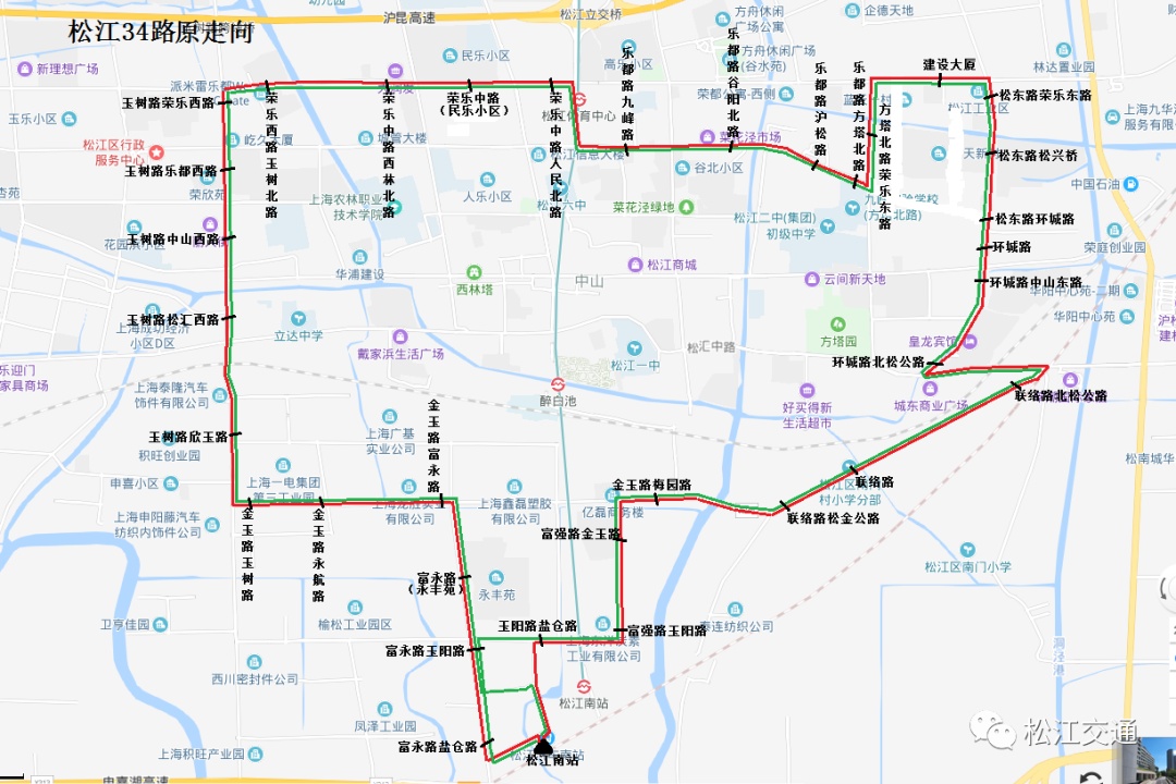 松江34路原走向:(上行)自松江南站起经盐仓路、玉阳路、富强路、金玉路、联络路、北松公路、环城路、松东路、荣乐东路、方塔北路、乐都路、九峰路、荣乐中路、玉树路、金玉路、富永路、盐仓路至松江南站。(下行)自松江南站起经盐仓路、中桥路、富永路、金玉路、玉树路、荣乐中路、九峰路、乐都路、方塔北路、荣乐东路、松东路、环城路、北松公路、联络路、金玉路、富强路、玉阳路、富永路、盐仓路至松江南站。
